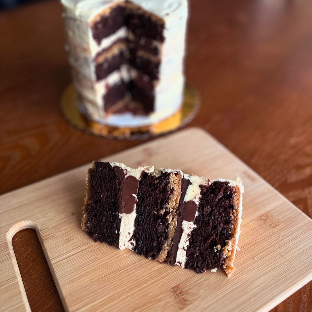 Sourdough S'mores Cake: layers of triple chocolate sourdough cake, organic graham cracker crust, chocolate ganache, marshmallow buttercream, and handmade marshmallow fluff